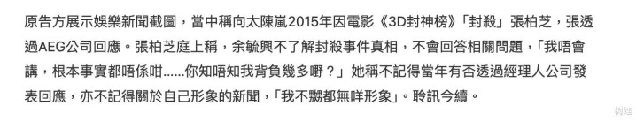张柏芝与前经理人余毓兴的这单官司,主要是因为在2011年、2012年张柏芝先后与对方签约了两份合约,收到对方提前支付的4276万片酬,但最后张柏芝却没有履行合约,继而遭到余毓兴索赔1276万。而在双方针锋相对的过程中,余毓兴这一方更是抛出一些陈年旧事来“抨击”张柏芝,包括张柏芝与另外的经理人向太的一些纠纷,也被拿到庭上重提,而这些对张柏芝而言又是另一种“伤痛”。不管怎么说,张柏芝要扛下这场官司,不简单,不容易。当然谁是谁非,最终还需要法官来定夺。